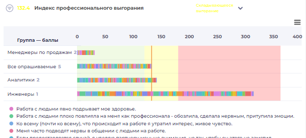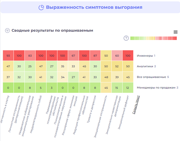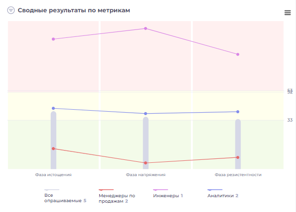 обобщенные данные о степени выраженности каждой из фаз выгорания, представленные в виде сводных результатов. У вас будет возможность сравнить результаты разных групп опрашиваемых по разным метрикам.