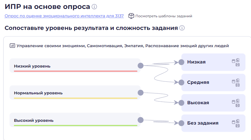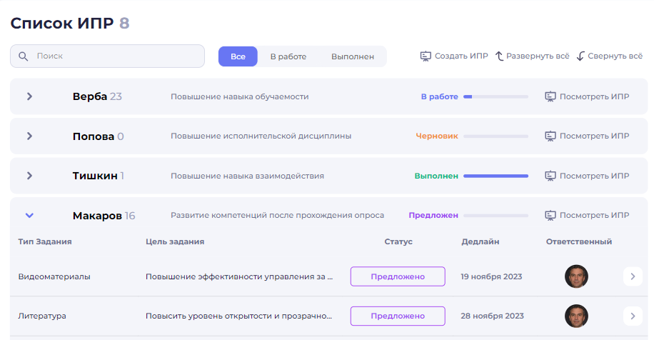Cоздание ИПР для большого количества сотрудников одновременно. Наша система автоматически наполняет ИПР готовыми заданиями из обширной базы знаний, что позволяет сэкономить время HR-специалистам;