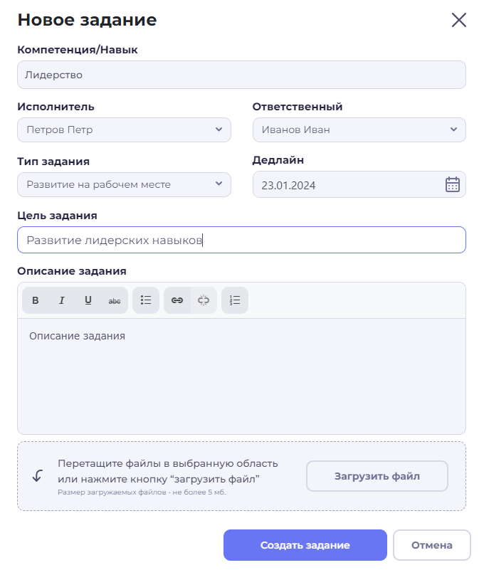 Возможность индивидуального описания каждого задания и прикрепления необходимых материалов.