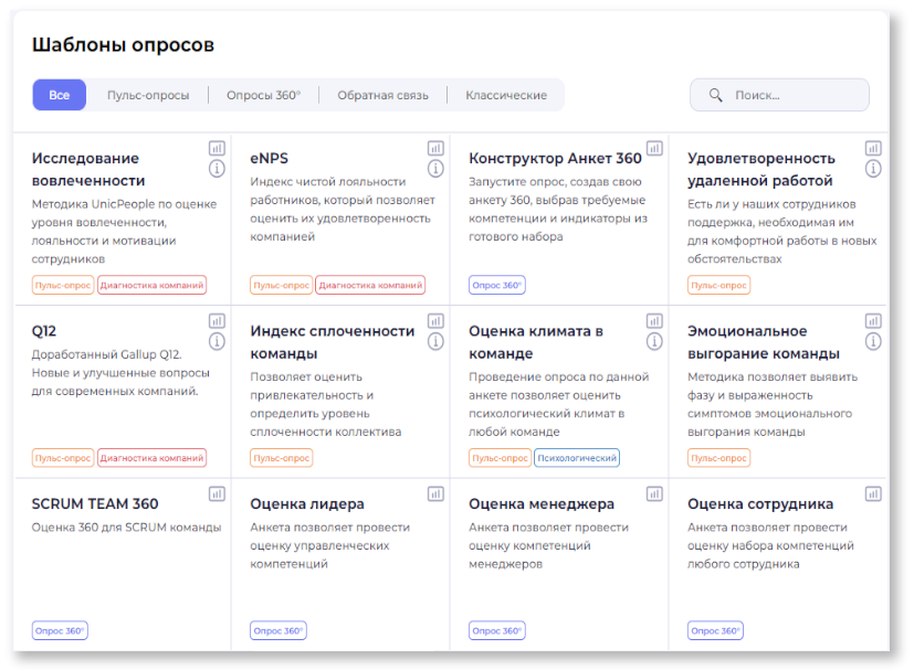Выбрав любую из уже встроенных в платформу и зарекомендованных методик исследования эффективности коллективов, вы сможете запустить опрос своих сотрудников за считанные минуты